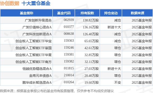 根据2025基金年报公募基金重仓股数据,重仓该股的公募基金共51家,其中持有数量最多的公募基金为广发基金的广发创新升级混合。广发创新升级混合目前规模为39.21亿元,最新净值2.724(4月14日),较上一交易日上涨3.11%,近一年上涨47.57%。该公募基金现任基金经理为刘格菘 吴远怡。刘格菘在任的基金产品包括:广发双擎升级混合A,管理时间为2018年11月2日至今,期间收益率为163.07%;广发科技先锋混合,管理时间为2020年1月22日至今,期间收益率为17.79%;广发行业严选三年持有期混合A,管理时间为2021年8月26日至今,期间收益率为-36.48%。吴远怡在任的基金产品包括:广发科技创新混合A,管理时间为2020年11月18日至今,期间收益率为84.89%;广发价值核心混合A,管理时间为2022年11月1日至今,期间收益率为110.21%;广发成长领航一年持有混合A,管理时间为2023年3月10日至今,期间收益率为140.23%。